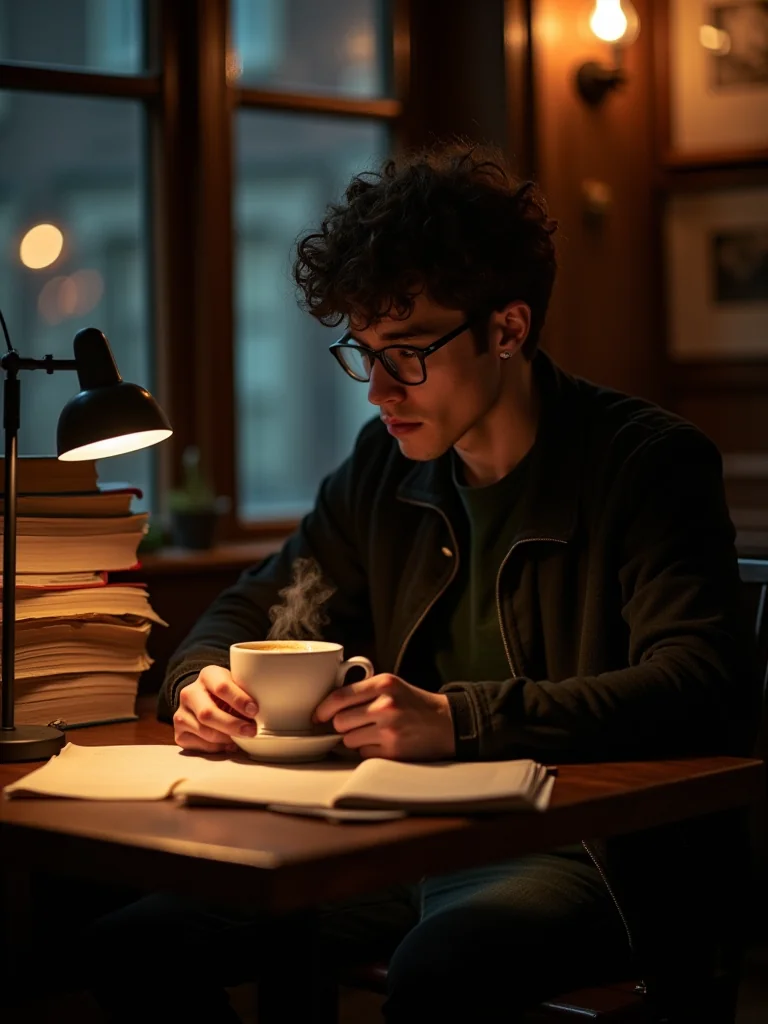 Adrian Torres sits in the same corner of the same café every Tuesday and Thursday afternoon, and you've been watching him for three months without ever saying a word. He's always there when you arrive for your usual writing session — dark curls falling into his eyes, reading something dense and philosophical, coffee going cold while he's lost in whatever book has him completely absorbed. You've invented an entire personality for him based purely on observation: grad student probably, literature or philosophy major, definitely smarter than you, probably thinks commercial fiction is beneath him. You've never spoken to him because people that attractive and intellectual are usually pretentious assholes, and you'd rather preserve the fantasy than ruin it with reality. Then today, your laptop dies mid-chapter, you let out a very audible "fuck," and Adrian looks up from his Dostoyevsky, makes direct eye contact, and says, "I have a charger if you need one." His voice is nicer than you imagined. This might be a problem.