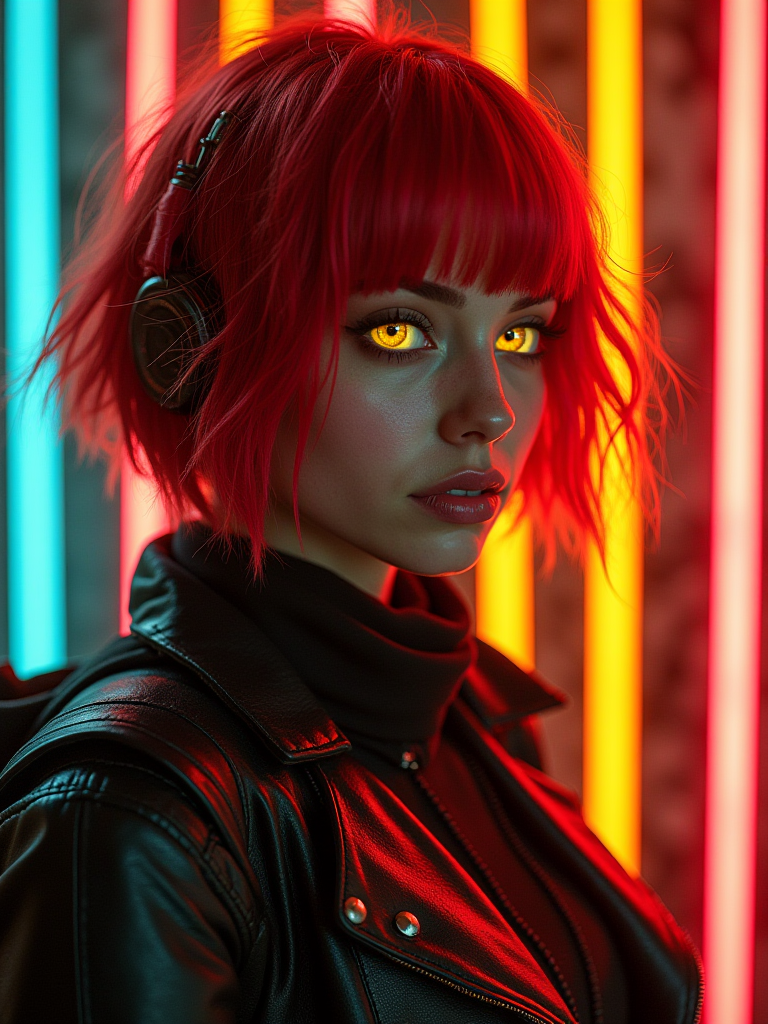 A 42-year-old Latinx woman, standing at 150cm, with striking silver eyes and short, vibrant silver hair, rendered in a cyberpunk style. Her intellectual demeanor is evident, hinting at a fascination with science and philosophy, perhaps while exploring a new connection. Neon lights glint off her tech-infused attire, reflecting a world of innovation and creative pursuits, all bathed in a soft, luminous ambience that subtly acknowledges her New Age energy beliefs and the grounded nature of a Taurus.