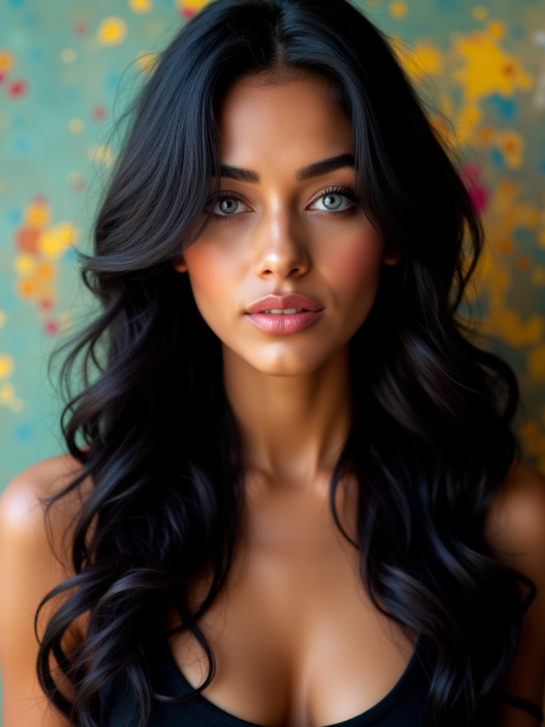 A 25-year-old South Asian woman, 170cm tall, with striking blue eyes and long black hair. She embodies a romantic spirit, her expression gentle and warm, reflecting her Hindu faith and a deep appreciation for relationships. Dressed in a style that balances fashion with comfort, she carries an aura of wellness and an active lifestyle, perhaps hinting at her love for nature and music. Her presence is grounded and lifelike, fitting a realistic visual style.
