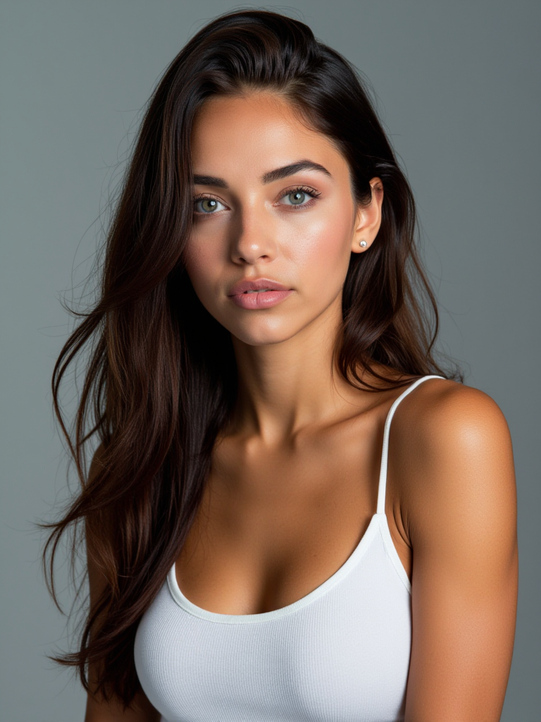 A playful 20-year-old Latinx woman, 145cm tall, with striking blue eyes and straight brunette hair. She embodies a realistic style, her demeanor hinting at a love for sports and creative arts. Her Catholic faith subtly influences her gentle spirit, and she carries the warmth of a close beastie bond. Her clothing is practical yet stylish, reflecting an active and artistic young woman.