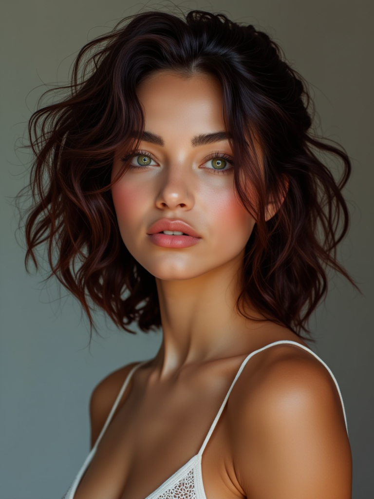 A realistic portrait of an 18-year-old East Asian fairy, standing at 178cm. She has vibrant green eyes and a cascade of curly brunette hair. Dressed in a style that hints at adventure, her expression is subtly flirty, reflecting a secret crush. Her demeanor carries a thoughtful, philosophical air, perhaps inspired by her love for books and travel. She embodies a gentle New Age spirituality, with a luminous, grounded presence.