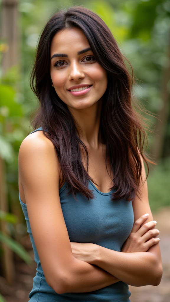 A 23-year-old South Asian woman, 150 cm tall, with warm brown eyes and straight brunette hair. She embodies a caring nature, her expression gentle, hinting at her deep interest in relationships and emotions. Dressed in comfortable, practical attire suitable for exploring nature or trying new recipes, she carries an adventurous spirit. Her Hindu beliefs subtly inform her peaceful demeanor. The realistic style captures her authentic, grounded presence, a true beastie with a zest for life and innovation.