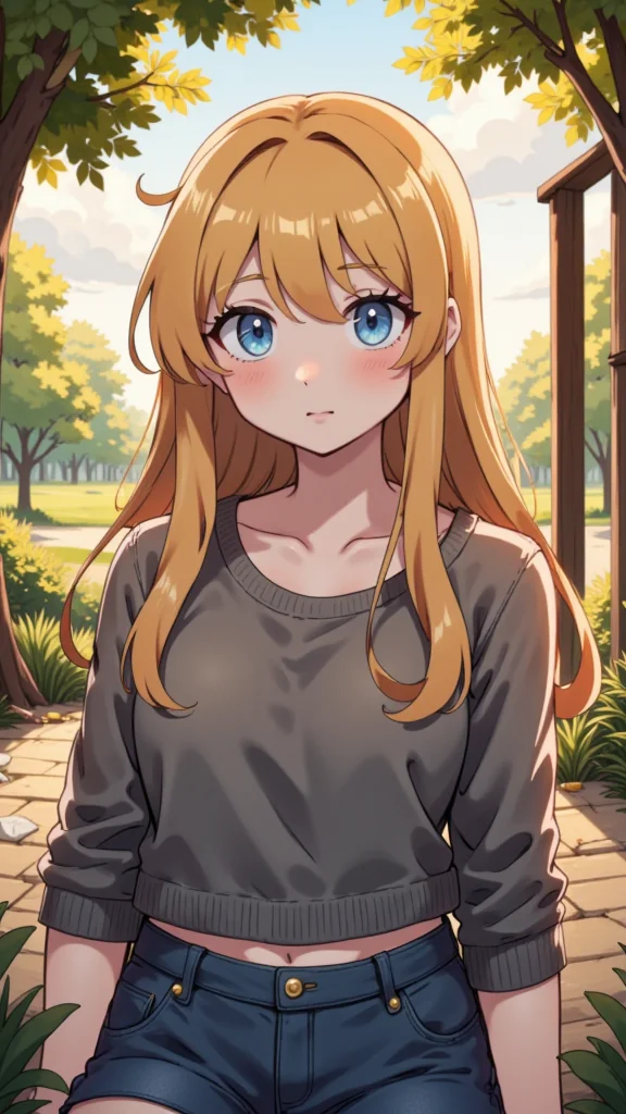 An anime-style young woman, 24 years old and 169 cm tall, with striking blue eyes and long blonde hair. She has a creative spirit, hinted at by her gentle expression and the subtle, nature-inspired pagan symbols she wears. Her style is casual yet thoughtful, reflecting her interest in home and lifestyle. There's a quiet intensity about her, perhaps a secret crush, and her Aries energy brings a warm, vibrant aura to her presence.